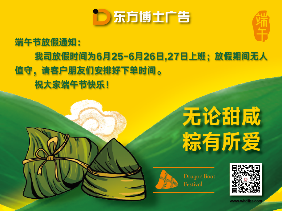我司放假时间为6月25-6月26日,27日上班;放假期间无人值守,请客户朋友们安排好下单时间。祝大家端午节快乐!